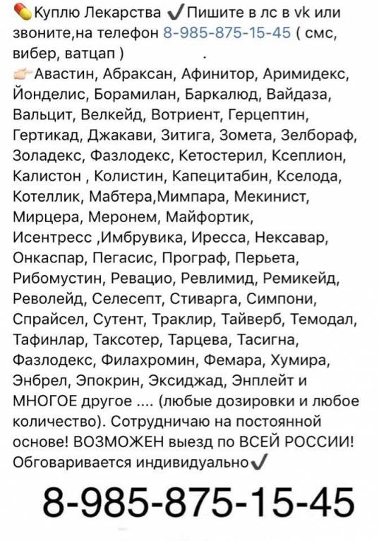 8-985-875-15-45 ( смс, вибер, ватцап ) .-Авастин, Абраксан, Афинитор, Ацеллбия, Алимта, Аранесп, Актилизе, Аримидекс, Йонделис, Борамилан, Бонефос, Баркалюд, Вайдаза, Вальцит, Велкейд, Вектибикс, Вотриент, Гемзар, Герцептин, Гертикад, Гливек, Гемзар, Джакави, Джаклинза, Зитига, Золерикс, Земплар, Зомета, Зелбораф, Золадекс, Иресса, Исентресс, Ибранса, Имбрувика, Фазлодекс, Кадсила, Кетостерил, Ксеплион, Келикс, Колистин, Капецитабин, Кселода, Котеллик, Ксалкори, Келикс, Кивекса, Котеллик, Мабтера, Мимпара, Мекинист, Мирцера, Меронем, Майфортик, Нексавар , Октагам, Октреотид, Онкаспар, Пегасис, Програф, Перьета, Рибомустин, Ребиф, Ревацио, Ревлимид, Ремикейд, Реддитукс, Револейд, Селесепт, Стиварга, Симзия, Солирис, Симпони, Спрайсел, Сутент, Траклир, Тайверб, Темодал, Тафинлар, Таксотер, Тарцева, Тасигна, Фазлодекс, Филахромин, Фемара, Хумира, Халавен, Цивалган, Энбрел, Эпокрин, Эксиджад, Энплейт и Многое другое .